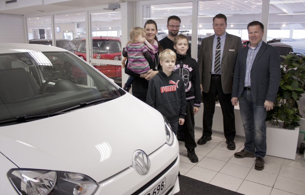 Kuva: Auto luovutettiin Forssan Laatuautossa. Kuvassa Tuomisto-Lundbergin perhe sekä Intersport Finlandin markkinointipäällikkö Mika Naaralainen ja Forssan Laatuautosta Myyntipäällikkö Mikko Lehtonen.