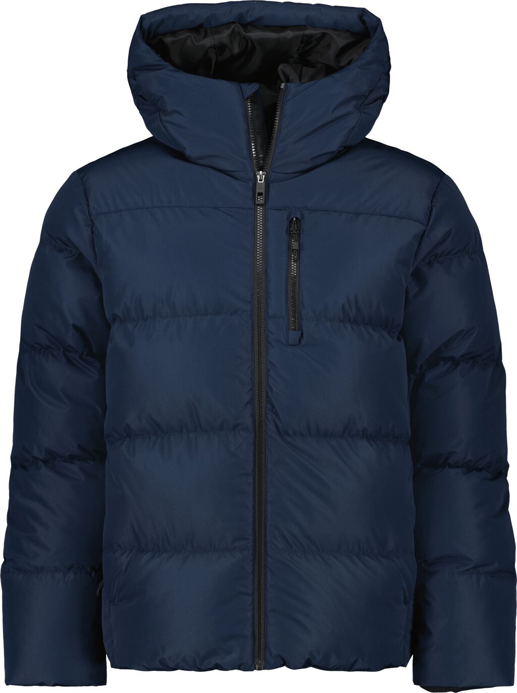 Miesten klassinen ja lämmin toppatakki untuvaa muistuttavalla synteettisellä täytteellä. Takin korkea kaulus ja tilava huppu tarjoavat lisäsuojaa sateelta ja tuulelta.