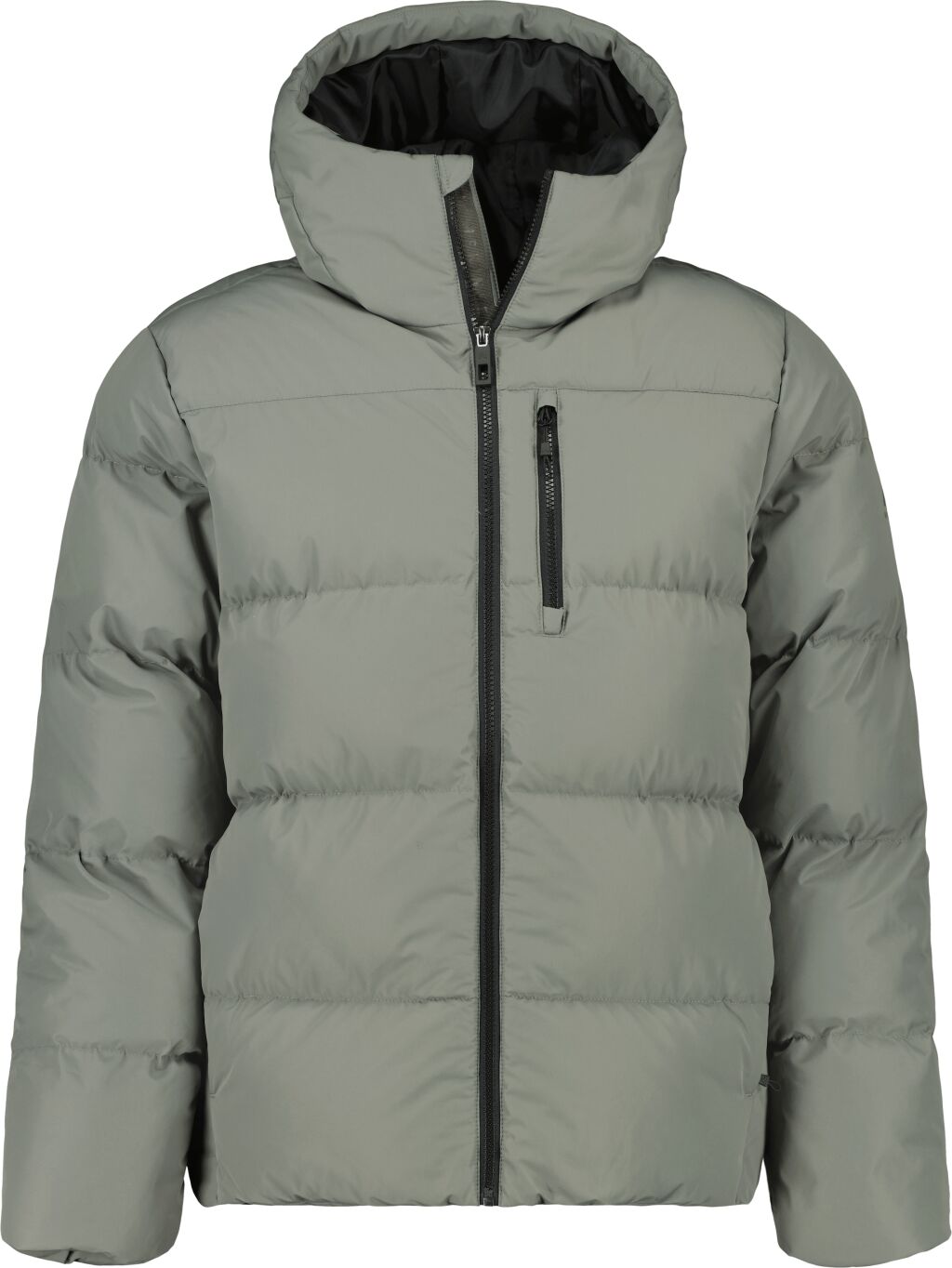 Miesten klassinen ja lämmin toppatakki untuvaa muistuttavalla synteettisellä täytteellä. Takin korkea kaulus ja tilava huppu tarjoavat lisäsuojaa sateelta ja tuulelta.
