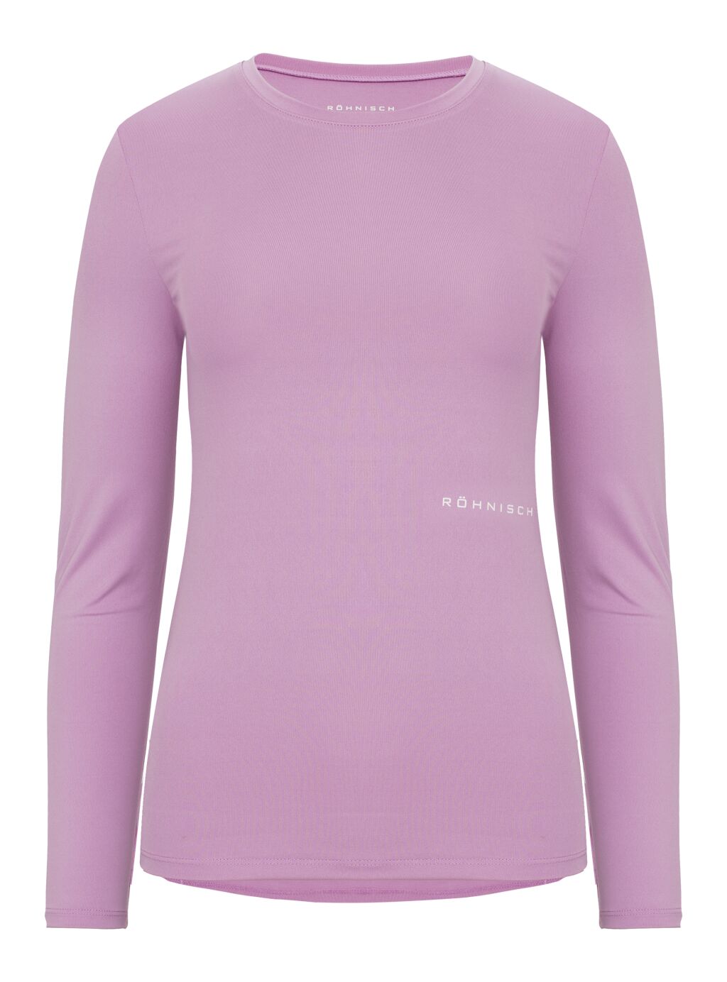 Naisten pitkähihainen paita kierrätetystä kankaasta mikä hengittää ja siirtää kosteutta iholta. Edessä ja niskassa Röhnisch -logoteksti.