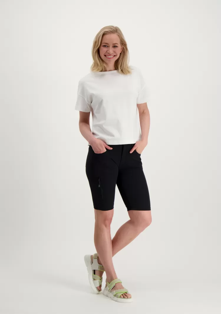 Sporttiset, polvimittaiset shortsit jossa korkeahko vyötärö.